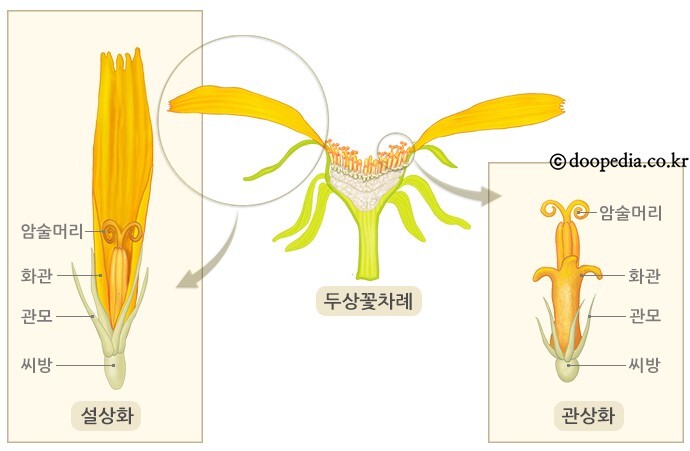 설상화는 색깔이 연분홍, 흰색, 붉은색 등으로 매우 다양하고 꽃잎의 끝이 톱니바퀴 모양으로 얕게 갈라지는 모양을 하고 있습니다. 통상화는 꽃밥이 갈색이며 열매를 맺습니다. 총포(總苞 involucre 꽃자루가 단축되어 포가 한 곳으로 밀집된 것) 조각은 두 줄로 배열되고, 달걀 모양이며 끝이 뾰족합니다. 열매는 수과(위부분 참조)이며 털이 없으며 끝부분이 부리 모양입니다.