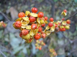 겨울에 노란 열매 껍질을 터트리며 붉은 열매를 드러낸 나무가 있으면 대체로 노박덩굴이거나 푼지 나무일 가능성이 큽니다. 잎이 없는 겨울에는 줄기 마디의 가시 여부로 판단하면 됩니다. 효능은 노박덩굴과 같습니다.