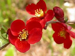 꽃은 이른 봄에 가지 끝에 1개씩 달리며 붉은색입니다. 꽃잎은 5~7개가 밑에서 합쳐져서 비스듬히 퍼지며, 수술은 많으며 꽃잎에 붙어서 떨어질 때 함께 떨어집니다.