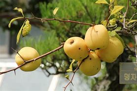 열매는 10월에 멪으며 타원형으로 길이는 10cm 정도로 푸른색과 붉은색이 섞여 있다가 완전히 익으면 노란색으로 됩니다.