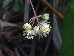 수꽃은 황록색으로 5개씩 꽃받침조각과 수술이 있으며, 원추꽃차례 (panicle, 우산이 펼쳐진 모양으로 꽃이 모여서)로 핍니다.