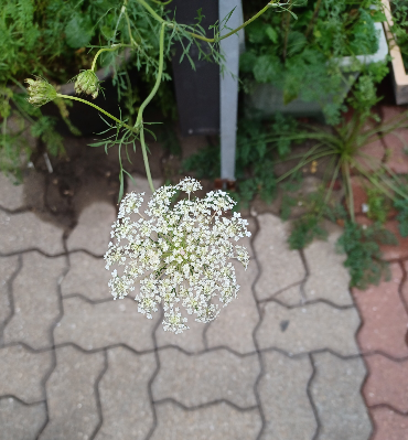 꽃은 흰색이거나 옅은 자주색으로 작은 꽃이 우산처럼 펼쳐져서 피어나며 7~10월에 핍니다. 날씨가 온난화로 따듯해져서 그런지 요즘도 자주 봅니다. 총포(꽃대의 끝에서 꽃의 밑동을 싸고 있는 비늘모양의 조각)는 원통형으로 4mm 정도의 흰색 털이 있습니다. 열매는 속이 익어도 벌여지지 않은 형태로 11월에 익습니다.