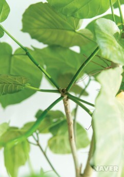 특이하게도 줄기를 자르면 절단면에서 흰즙이 나오는 것이 휘카스 움베르타와 같다. 어려서는 화살촉 모양의 홑잎이다가 자라면 잎 가장자리가 3갈래로 갈라집니다. 잎에는 흰색, 은색, 노란색의 반점이 있습니다.