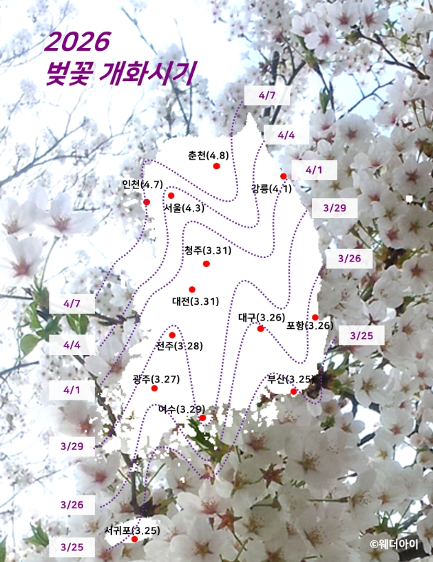 서울의 벚꽃 개화 예상일은 4월 3일이며, 만개 시기는 약 일주일 뒤인 4월 10일경으로 전망된다.